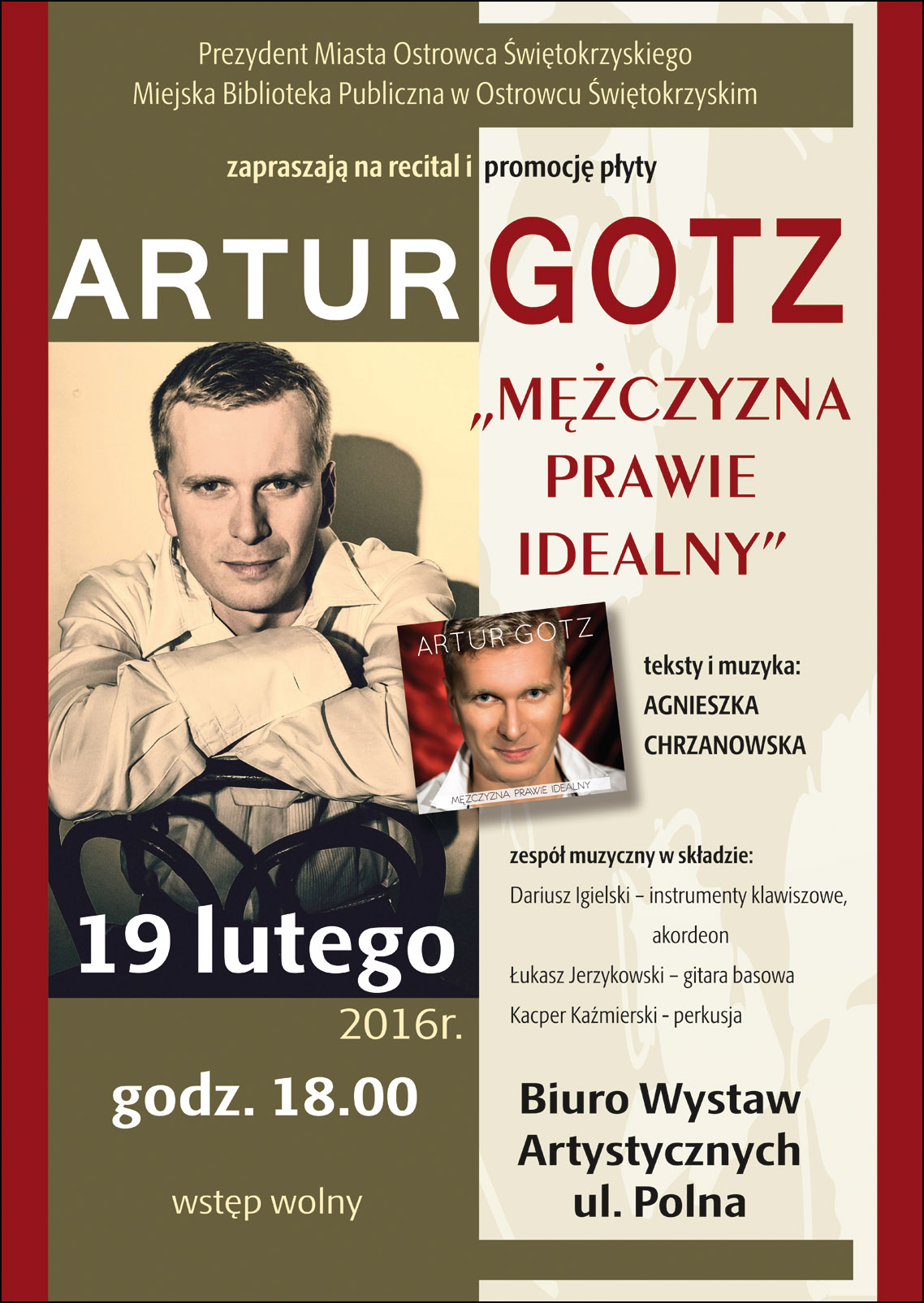 Recital, który odbędzie się 19 lutego o godz. 18.00 to promocja płyty Artur Gotz - „Mężczyzna prawie idealny”. Aktorowi będzie towarzyszył zespół muzyków : Dariusz Igielski – instrumenty klawiszowe, akordeon, Łukasz Jerzykowski – gitara basowa, Kacper Kaźmierski – perkusja.