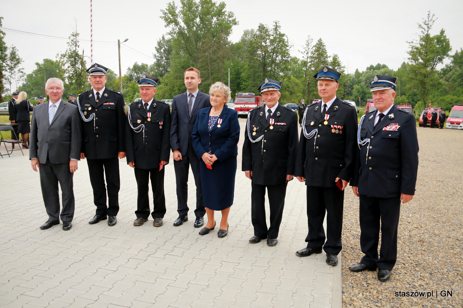 W uroczystościach wzięli udział przedstawiciele oraz poczty sztandarowe wszystkich jednostek OSP z terenu Gminy Staszów, przedstawiciele samorządu: burmistrz Staszowa Leszek Kopeć, zastępca burmistrza Ewa Kondek, przewodniczący Rady Miejskiej Ireneusz Kwiecjasz oraz radni Rady Miejskiej. Obecni na uroczystościach byli także: posłowie na Sejm RP Michał Cieślak, Krystian Jarubas, Krzysztof Lipiec.