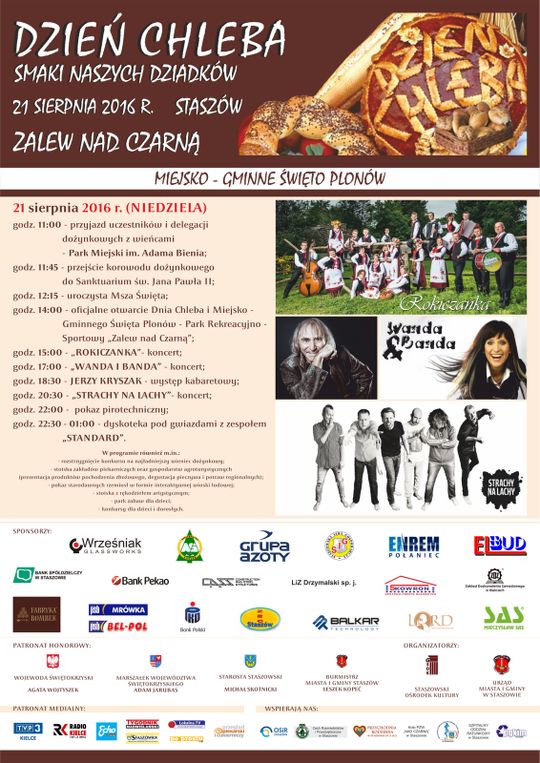 Podczas "Dnia Chleba" Miasto i Gmina Staszów organizują dożynki, których nieodłączną częścią jest konkurs wieńców dożynkowych i prezentacja wyrobów regionalnych piekarń.
