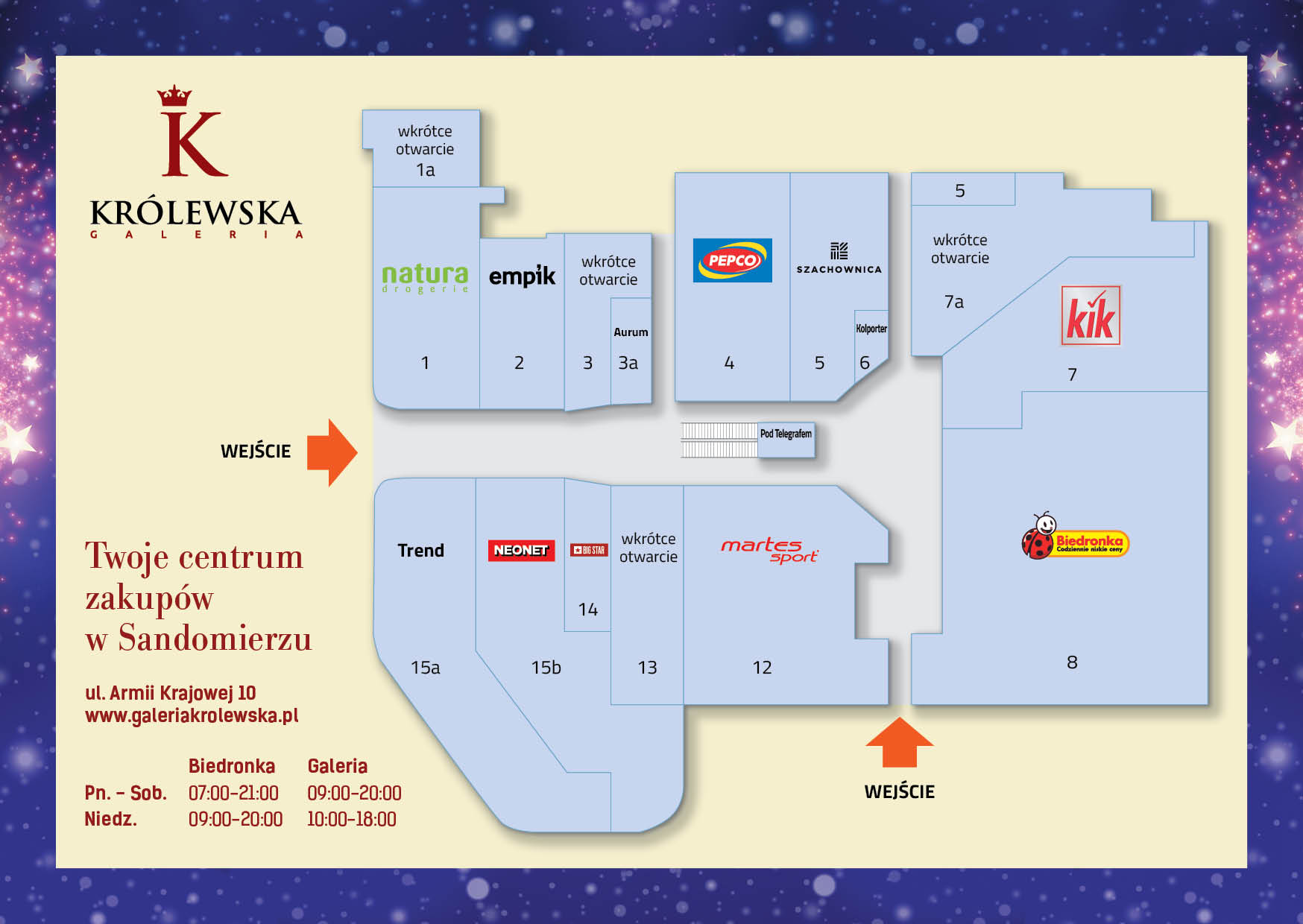 15 grudnia, od godz. 11.00, po oficjalnej ceremonii otwarcia obiektu, mieszkańcy Sandomierza i okolic będą mogli zakupić produkty znanych i lubianych marek. W galerii otworzą się m.in. takie sklepy jak Biedronka, Neonet, Martes Sport, Empik, drogeria Natura, Pepco, KIK, Big Star, Szachownica i Trend, a także salonik prasowy sieci Kolporter.