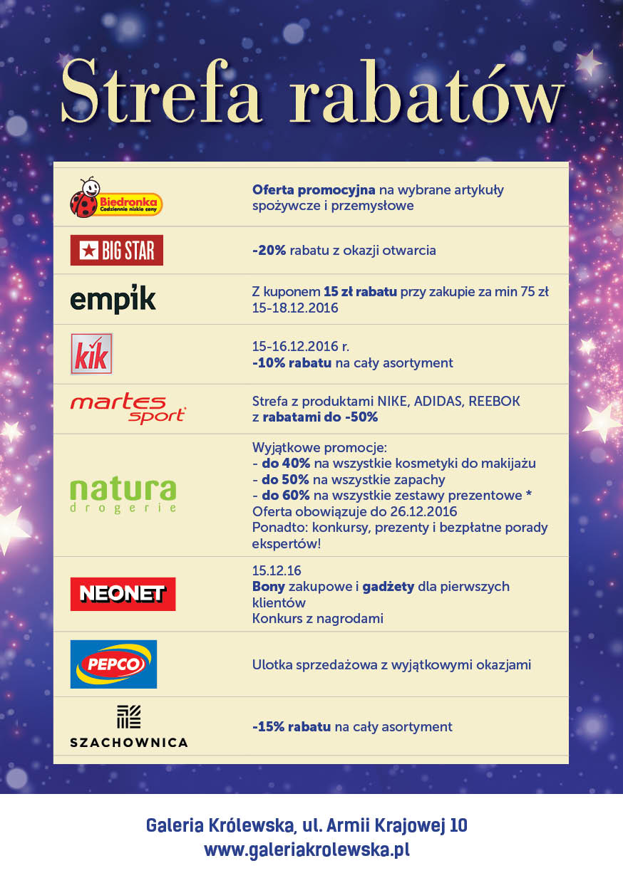 Wszystkich klientów zapraszamy od 15 grudnia. Zabawa zaczyna się od godz.11.00! Już od pierwszego dnia sklepy zaproponują Klientom specjalne rabaty i atrakcyjne oferty. Oprócz świątecznych atrakcji i konkursów, nie zabraknie słodkich upominków dla najmłodszych. Będą animacje, stanowiska warsztatowe, malowanie buziek i mnóstwo dobrej zabawy! Na pierwszej wizycie w galerii, obdarujemy też dzieci kolorowymi gadżetami, a dorośli będą mieli okazję do zdobycia cennych nagród czy bonów zakupowych.