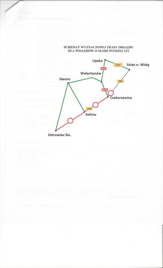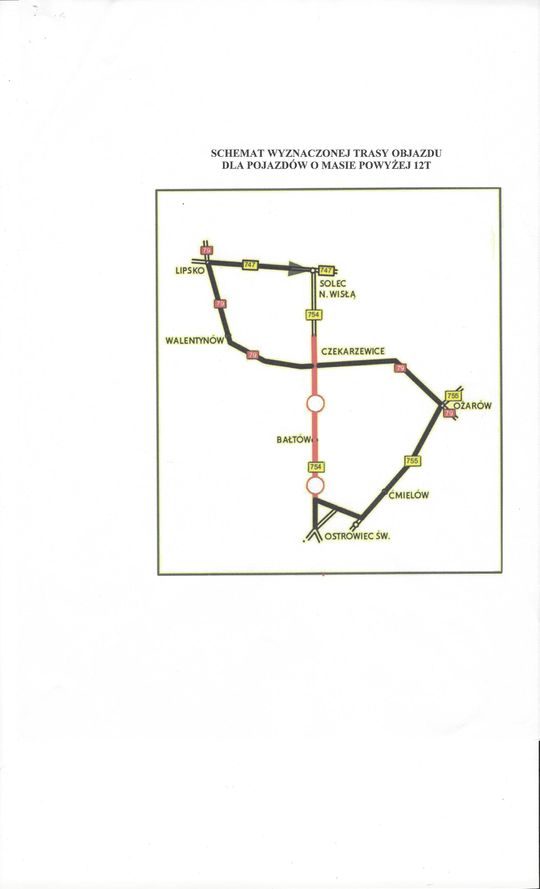 Dla pojazdów o masie powyżej 12 ton objazd odbywał się będzie: ul. Jana Samsonowicza, DW 755 (m.in. przez, Ćmielów, Ożarów), DK 79 przez m.in. Tarłów i Lipsko oraz DW 747 do Solca nad Wisłą.