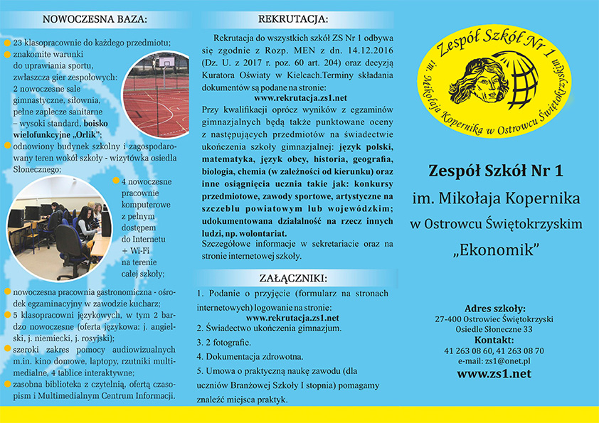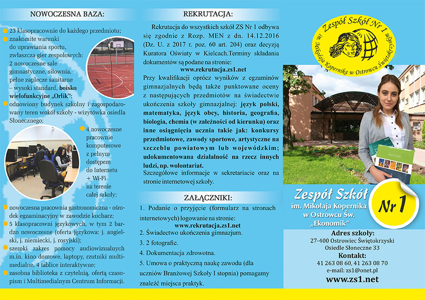 Rekrutacja do szkół ZS nr I odbywa się zgodnie z Rozp. MEN z dn. 14.12.2016 (Dz. U. z 2017r. poz. 60 art. 204) oraz z decyzją Kuratora Oświaty w Kielcach. Szczegółowe informacje dotyczące rekrutacji dostępne są w sekretariacie oraz na stronie internetowej szkoły. Terminy składania dokumentów podane są na stronie internetowej: www.rekrutacja.zs1.net.