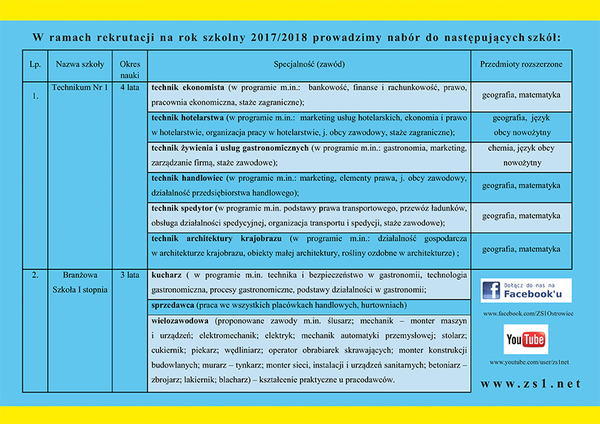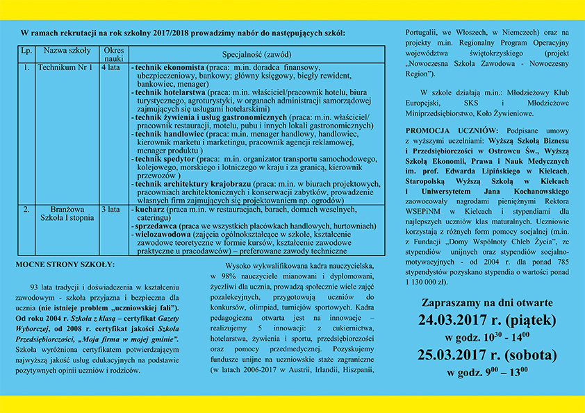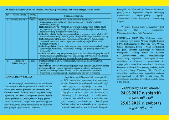 W ramach rekrutacji na rok 2017/2018 placówka prowadzi nabór do Technikum nr I oraz do Branżowej Szkoły I stopnia. Uczniowie wybierający technikum będą uczyć się przez 4 lata i mogą wybrać takie zawody jak: technik ekonomista, technik hotelarstwa, technik żywienia i usług gastronomicznych, technik handlowiec, technik spedytor, technik architektury krajobrazu. Natomiast Ci, którzy postawią na Branżową Szkołę swoją naukę kontynuować będą przez 3 lata na wybranej specjalności: kucharz, sprzedawca oraz wielozawodowa.